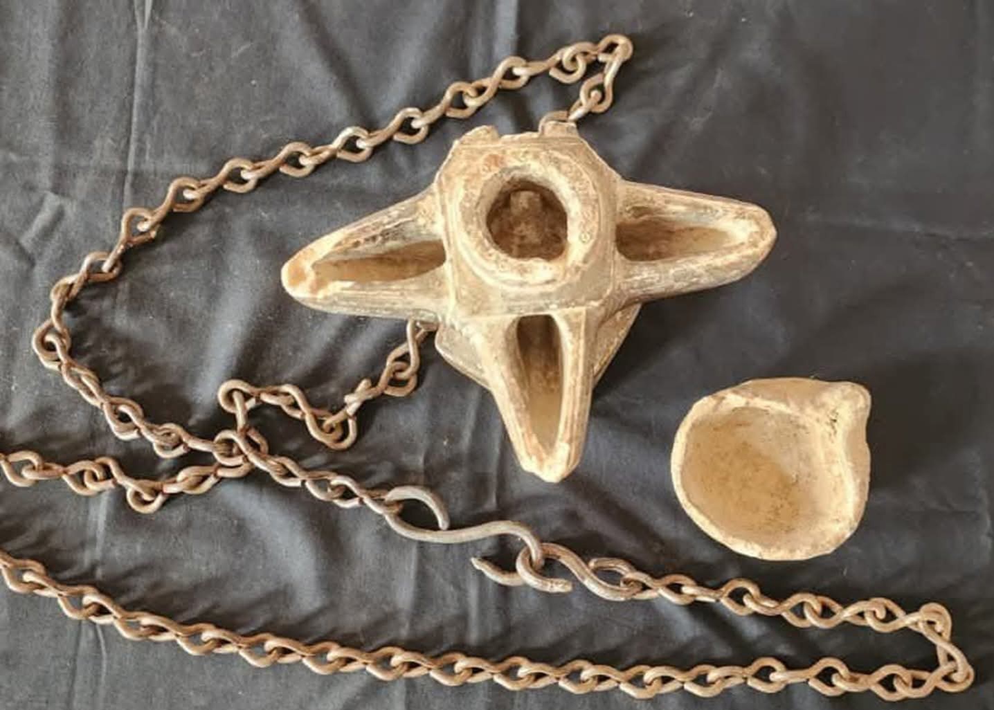 He described the items in detail: a stone plate oil lamp carved from natural stone, a traditional clay lamp, and a metal chain likely used for lighting or decorative purposes.etsy.com